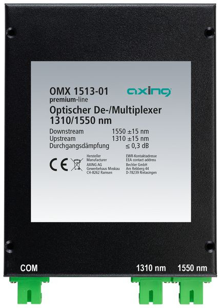 | Kurzbeschreibung | Optischer De-/Multiplexer 1310/1550 nm Multiplext Signale mit 1310 nm und 1550 nm auf eine Glasfaser |