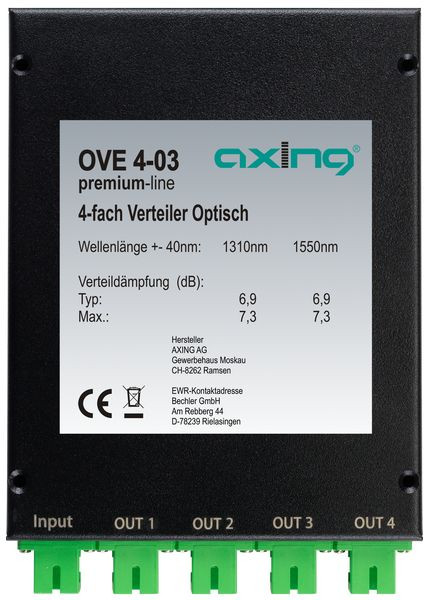 | Kurzbeschreibung | Optischer 4-fach-Verteiler Zur Verteilung optischer Signale Mit SC/APC-Buchsen |