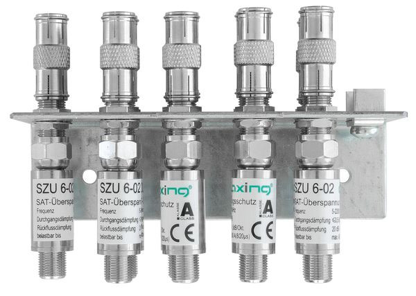 Erdungswinkel, zweireihig, Überspannungsschutz 9-fach Erdung und Potentialausgleich gemäß EN 60728-11 für AXING Multischalter SPU/SES 9xx-06 am Eingang Inkl. Überspannungsschutzgeräte SZU 6-02 Bestückt mit premium-line F-Doppelbuchsen CFA 26-02 und Quickfix-Adapter CFA 4-01