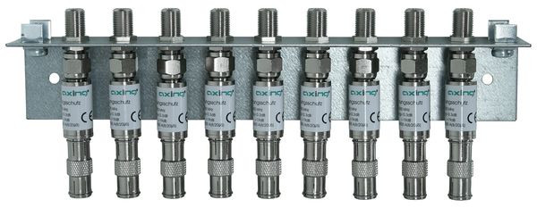 Erdungswinkel, einreihig, Überspannungsschutz 9-fach Erdung und Potentialausgleich gemäß EN 60728-11 Für AXING Multischalter SPU 9xx-05 am Eingang Inkl. Überspannungsschutzgeräte SZU 6-02 Bestückt mit premium-line F-Doppelbuchsen CFA 26-02 und Quickfix-Adapter CFA 4-01