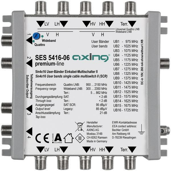 Einkabel-Multischalter II, 5 in 4 x 16, premium-line 1 SAT-Position mit Quattro-LNB 2 SAT-Positionen mit Wideband-LNBs Mit terrestrischer Einspeisung Breitbandig rückkanaltauglich (EoC geeignet bis 204 MHz) Kaskadierbar 4 Ausgänge mit je 16 User-Bändern Einkabel I und II kompatibel (entspricht EN 50607 und EN 50494) Störungssicher, keine wohnungsübergreifende Beeinflussung beim Einsatz von programmierbaren SSD 6-xx Antennensteckdosen Alternativ bis zu 4 Legacy-Ausgänge (nicht bei Wideband-LNBs oder SSD 6-xx) Versorgung über ext. Netzteil SZU 99-06 (nicht im Lieferumfang enthalten)