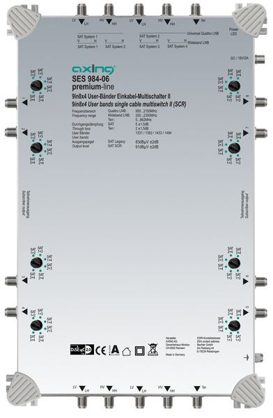 Einkabel-Multischalter II, 9 in 8 x 4, premium-line 2 SAT-Positionen mit Quattro-LNB 4 SAT-Positionen mit Wideband-LNBs (nur EN 50607) 2 aus 4 SAT-Positionen mit Wideband-LNBs (EN 50494) Mit terrestrischer Einspeisung Breitbandig rückkanaltauglich (EoC geeignet bis 204 MHz) Kaskadierbar 8 Ausgänge mit je 4 User-Bändern Einkabel I und II kompatibel (entspricht EN 50607 und EN 50494) Störungssicher, keine wohnungsübergreifende Beeinflussung beim Einsatz von programmierbaren SSD 6-xx Antennensteckdosen Alternativ bis zu 8 Legacy-Ausgänge (nicht bei Wideband-LNBs oder SSD 6-xx) Versorgung über ext. Netzteil SZU 99-06 (nicht im Lieferumfang enthalten)