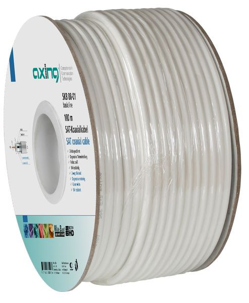 Koaxialkabel, 2-fach geschirmt, 100 m Für SAT-/CATV-Hausinstallation Brandklasse Eca gemäß EN 50575 Innenleiter StCu, Durchmesser 1,02 mm Physikalisch geschäumtes Dielektrikum, Durchmesser 4,7 mm Schirmung Alufolie/Alu-Geflecht Mantel PVC, weiß Degressive Metereinteilung 100 m auf Pappkartonspule