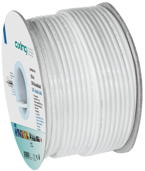 Flammwidriges, halogenfreies Koaxialkabel, 3-fach geschirmt, 100 m Für SAT-/CATV-Hausinstallation Vodafone gelistet Gemäß KDG 1 TS 153 Klasse A+ gemäß EN 50117-9-2 Brandklasse Cca gemäß EN 50575 Innenleiter Cu, Durchmesser 1,02 mm Physikalisch geschäumtes Dielektrikum, Durchmesser 4,6 mm Schirmung Alufolie, geklebt/verzinntes Cu-Geflecht/Alufolie Mantel LSZH, weiß, UV-beständig Degressive Metereinteilung 100 m auf Pappkartonspule