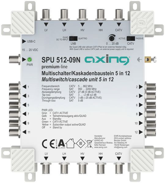 Multischalter Stand-Alone/Kaskadenbaustein, 5 in 12, premium-line Für bis zu 12 Teilnehmer SAT aktiv und Quad-LNB-tauglich CATV-Zweig aktiv schaltbar und einstellbar Breitbandig rückkanaltauglich bei passivem CATV-Zweig (geeignet für EoC bis 204 MHz) Bei passivem CATV-Zweig und Quattro-LNB Receiver-gespeist ? kein Netzteil nötig Bei aktivem CATV-Zweig oder Quad-LNB Stromversorgung über ext. Netzteil SZU 99-09N (nicht im Lieferumfang enthalten) oder über die SAT-ZF-Stammleitungen Zeitgemäße Standby- und Energiesparfunktionalitäten Kaskadierbar (nicht verwendete Kaskadeausgänge müssen mit DC-entkoppelten 75 Ohm Abschlusswiderständen abgeschlossen werden (z. B. CFA 11-00, nicht im Lieferumfang enthalten)