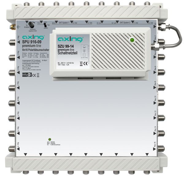 SAT 950-2.200 MHz, Rückkanaltauglich, für digitale Übertragung geeignet Aktiver Multischalter, 9 in 16, premium-line Für bis zu 16 Teilnehmer SAT und terrestrisch aktiv Terrestrik einstellbar und passiv schaltbar (dadurch rückkanaltauglich) Kaskadierbar Quad-LNB-tauglich Breitbandig rückkanaltauglich (EoC geeignet bis 204 MHz) Schaltnetzteil (bis 10 m absetzbar)