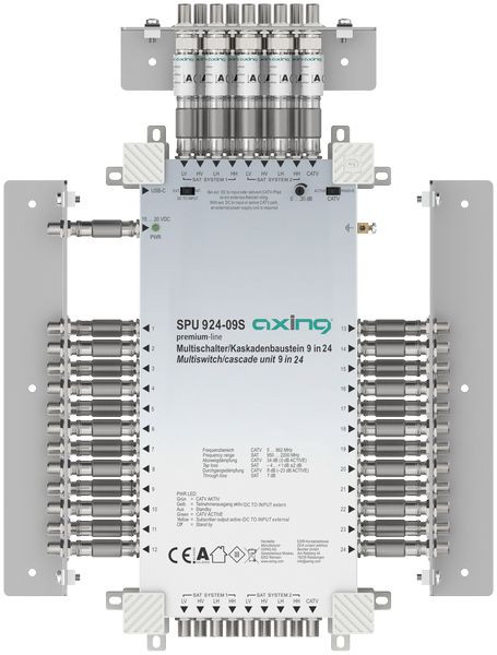 Multischalter Stand-Alone/Kaskadenbaustein, 9 in 24, premium-line Für bis zu 24 Teilnehmer SAT aktiv, CATV-Zweig aktiv schaltbar und einstellbar Breitbandig rückkanaltauglich bei passivem CATV-Zweig (geeignet für EoC bis 204 MHz) Bei passivem CATV-Zweig Receiver-gespeist ? kein Netzteil nötig Bei aktivem CATV-Zweig Stromversorgung über ext. Netzteil SZU 99-09S (nicht im Lieferumfang enthalten) oder über die SAT-ZF-Stammleitungen Zeitgemäße Standby- und Energiesparfunktionalitäten (z. B. nur der benötigte LNB wird versorgt) Kaskadierbar (nicht verwendete Kaskadeausgänge müssen mit DC-entkoppelten 75 Ohm Abschlusswiderständen abgeschlossen werden (z. B. CFA 11-00, nicht im Lieferumfang enthalten)