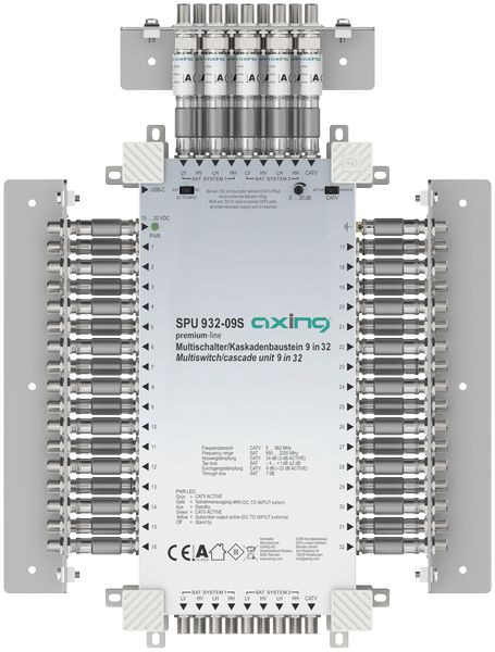 Multischalter Stand-Alone/Kaskadenbaustein, 9 in 32, premium-line Für bis zu 32 Teilnehmer SAT aktiv, CATV-Zweig aktiv schaltbar und einstellbar Breitbandig rückkanaltauglich bei passivem CATV-Zweig (geeignet für EoC bis 204 MHz) Bei passivem CATV-Zweig Receiver-gespeist ? kein Netzteil nötig Bei aktivem CATV-Zweig Stromversorgung über ext. Netzteil SZU 99-09S (nicht im Lieferumfang enthalten) oder über die SAT-ZF-Stammleitungen Zeitgemäße Standby- und Energiesparfunktionalitäten (z. B. nur der benötigte LNB wird versorgt) Kaskadierbar (nicht verwendete Kaskadeausgänge müssen mit DC-entkoppelten 75 Ohm Abschlusswiderständen abgeschlossen werden (z. B. CFA 11-00, nicht im Lieferumfang enthalten)