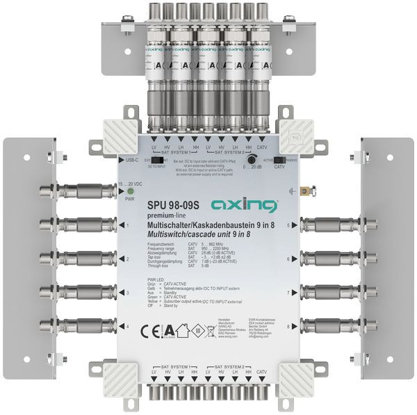 Multischalter Stand-Alone/Kaskadenbaustein, 9 in 8, premium-line Für bis zu 8 Teilnehmer SAT aktiv, CATV-Zweig aktiv schaltbar und einstellbar Breitbandig rückkanaltauglich bei passivem CATV-Zweig (geeignet für EoC bis 204 MHz) Bei passivem CATV-Zweig Receiver-gespeist ? kein Netzteil nötig Bei aktivem CATV-Zweig Stromversorgung über ext. Netzteil SZU 99-09S (nicht im Lieferumfang enthalten) oder über die SAT-ZF-Stammleitungen Zeitgemäße Standby- und Energiesparfunktionalitäten (z. B. nur der benötigte LNB wird versorgt) Kaskadierbar (nicht verwendete Kaskadeausgänge müssen mit DC-entkoppelten 75 Ohm Abschlusswiderständen abgeschlossen werden (z. B. CFA 11-00, nicht im Lieferumfang enthalten)