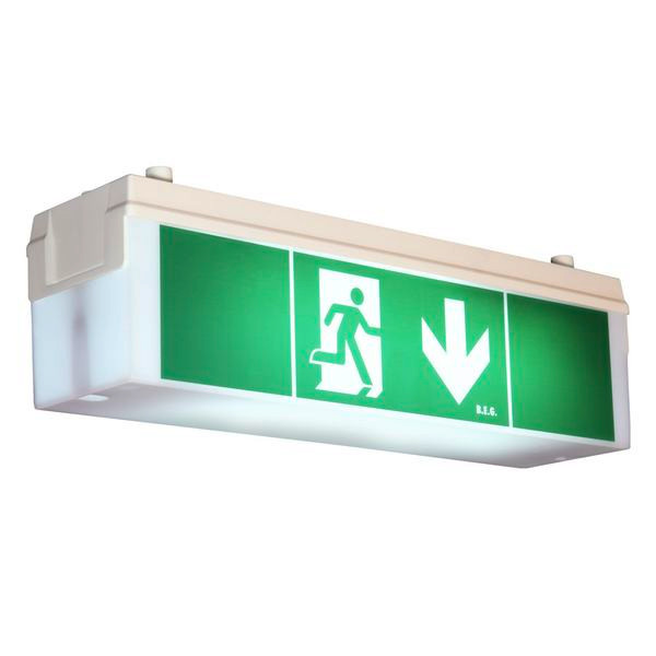 Rettungszeichen-/Fluchtwegleuchte mit Einzelbatterie, Robustes Kunststoffgehäuse IP54, Erkennungsweite 14 m, Umweltfreundlicher NiMH-Akku, Nennbetriebsdauer 1 oder 3 Stunden je nach Lampe, Taster am Gehäuse für den Funktionstest, Inkl. Leuchtmittel, Akku und vier Piktogrammen