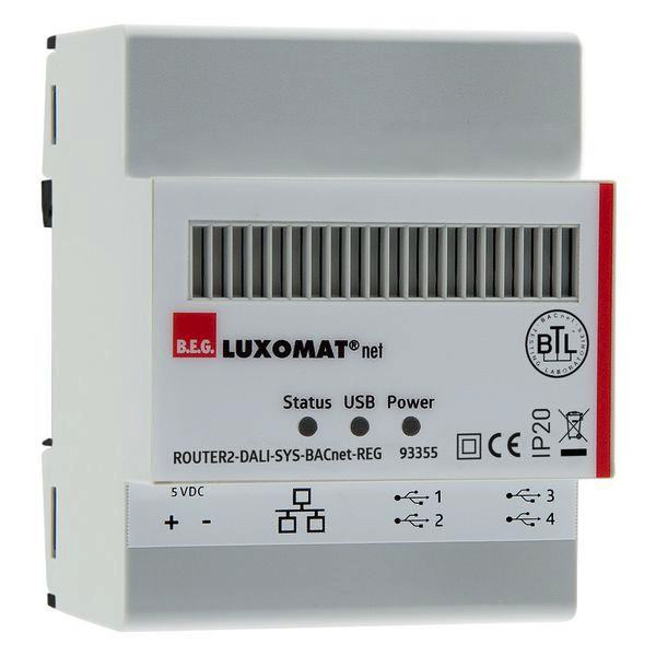 Router mit integriertem Web-Server und Applikations-Controller für die Hutschienenmontage nach DIN EN 60715, 4 USB-Anschlüsse für die Ansteuerung von bis zu 4 separat erhältlichen B.E.G. Applikations-Controller mit integriertem DALI-Netzteil, 1 LAN-Anschluss für die Vernetzung von bis zu 100 Geräten, bis zu 400 miteinander vernetzte DALI-Linien möglich, Integrierte BACnet/IP-Schnittstelle, BACnet Gerätetyp B-ASC (Application Specific Controller), BACnet Gerätetyp B-GW (Gateway), Dynamisch generierte BACnet Objekte, Multi-State BACnet-Ausgänge für Szenen- und Automatikübersteuerung, Analoge BACnet-Ausgänge für Dimmwertübersteuerung, Analoge BACnet-Eingänge für Dimmwertstatusabfragen, Digitale BACnet-Eingänge für Präsenzstatusabfragen, Digitale BACnet-Eingänge für Gerätezustandsabfragen, Zentrale Verwaltung von Parameter, Adressen, Gruppen und Szenen aller vernetzten DALI-Teilnehmer, Dezentrale Applikationslogik in Multisensoren und Tastern - Router übernimmt nur übergeordnete Funktionen, Benutzer- und Rechteverwaltung für unterschiedliche Rollen , DALI-Notleuchten Manager, Erweiterte Begleitlichtfunktion GUIDED LIGHT PLUS (DALI-Linien-übergreifend), Ereignis-Routingfunktion, um DALI-Linienübergreifende Beleuchtungszonen realisieren zu können, Update-Manager, für Aktualisierung der Router-Firmware über LAN/WAN, Bedienbar über kompatible Web-Browser beliebiger Endgeräte (Smartphone, Tablet, PC), Analyse- und Diagnosetools für Fehlersuche, Temperaturüberwachung von Hauptprozessor und Gehäuse, Hochwertiger Lüfter mit automatischer Drehzahlregelung, Integrierte Echtzeituhr, LED-Statusanzeige, Inklusive separat beigelegter 5VDC/2A-Spannungsversorgung für Hutschienenmontage (1TE), Inklusive 4 USB-Verbindungskabel (0,5m) und 1 LAN-Kabel (0,5m), Honorarfreie Planungsunterstützung von B.E.G., Kostenpflichtige Inbetriebnahme von B.E.G., Fernwartungsoption über eine vorhandene oder von B.E.G. bereitgestellte VPN-Verbindung, Kleinere Wartungsarbeiten (z.B. Leuchtentausch) können von einem Haustechniker oder lokalen Elektro-Installateur eigenständig durchgeführt werden, Bei diesem Artikel handelt es sich um eine Komponente eines Lichtsteuerungssystems von B.E.G., welches den Einsatz von DALI-Betriebsgeräten (Leuchten, Relais) anderer Hersteller unterstützt, Der Einsatz von DALI-Applikations-Controller anderer Hersteller wird nicht unterstützt, Der Einsatz von DALI-Eingabegeräten (Sensoren, Taster) anderer Hersteller wird nicht unterstützt, Es sind zusätzliche Systemkomponenten (Hardware) von B.E.G. erforderlich, Es sind zusätzliche Dienstleistungen (Planung, Inbetriebnahme und Wartung) von B.E.G. erforderlich
