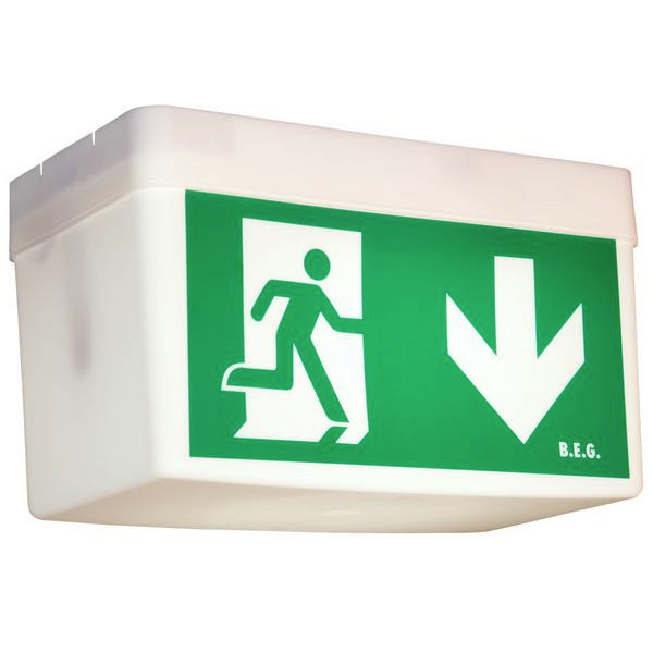 Rettungszeichen-/Fluchtwegleuchte mit Einzelbatterie, Robustes Kunststoffgehäuse IP54, Erkennungsweite 21 m, Umweltfreundlicher NiMH-Akku, Nennbetriebsdauer 3 Stunden, Taster am Gehäuse für den Funktionstest, Inkl. Leuchtmittel, Akku und vier Piktogrammen