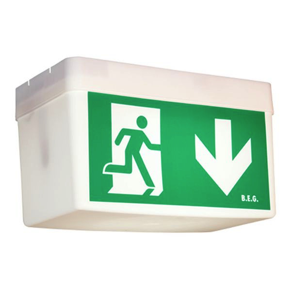 LED-Rettungszeichen-Leuchte mit Einzelbatterie, Robustes Kunststoffgehäuse IP54, Helle und gleichmäßigen Ausleuchtung, Umweltfreundlicher NiMH-Akku mit Tiefentladeschutz, Bidirektional fernbedienbar mit dem IR-Adapter und der B.E.G.-Smartphone-App, Automatischer Selbsttest mit einer zweifarbigen Status-LED, <b>Optional:</b> Zentrale Überwachungsmöglichkeit mit B.E.G.-DALI-SYS über einen DALI-Bus, Inkl. LED-Leuchtmittel, Akku und vier Piktogrammen