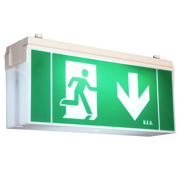 Rettungszeichen-/Fluchtwegleuchte mit Einzelbatterie, Robustes Kunststoffgehäuse IP54, Erkennungsweite 25 m, Umweltfreundlicher NiMH-Akku, Nennbetriebsdauer 1 oder 3 Stunden, Taster am Gehäuse für den Funktionstest, Inkl. Leuchtmittel, Akku und vier Piktogrammen