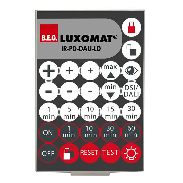 Infrarot-Fernbedienung zum komfortablen Einstellen oder Ändern der Parameter, Extra große Reichweite, Inklusive Wandhalterung, Einfache Programmierung der Präsenzmelder-Serien, - PD2-M-DALI/DSI, - PD4-M-DALI/DSI, - PD4-M-DALI/DSI-K, - PD9-M-DALI/DSI, - PD9-M-DALI/DSI-GH, - PD4-M-DUO-DALI