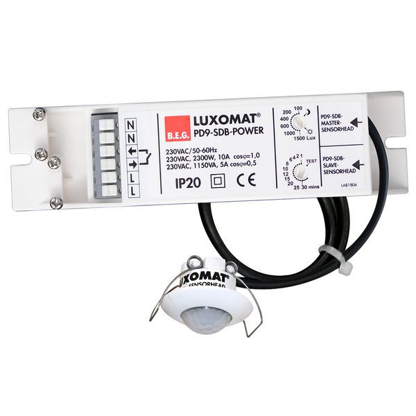 Mini-Präsenzmelder als Master- und Slave-Funktion, Mastergerät fernbedienbar mit IR-PD9 (separat zu bestellen), Melder mit Schutzart IP65 speziell für Feuchträume, Schaltleistung 2300 W, Erfassungsbereich bis Ø 10m.