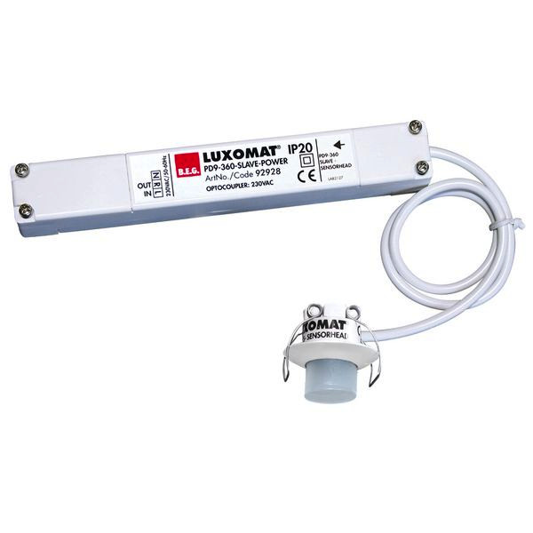 Mini-Slave-Gerät, speziell für große Höhen, zur Erweiterung des Erfassungsbereiches eines Master-Gerätes, Schaltimpuls zum Master-Gerät bei erkannter Bewegung unabhängig von der Umgebungshelligkeit, Mit 230 V-Master-Geräten kompatibel, für Ausnahmen siehe bitte das jeweilige Master-Gerät., Leistungsteil passt durch die Bohrung für den Melder in der Decke (bei 34 mm d. ), Federklemmen für den einfachen und schnellen Einbau in abgehängte Decken und in Leuchten, Inklusive d. 45 mm Abdeckring und Abdecklamelle