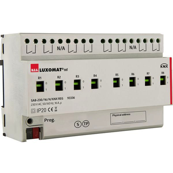 Schaltaktor zum Schalten von Verbrauchern, KNX-Reiheneinbaugerät der Breite 4 TE (SA4 - 230 / 16 /) oder 8 TE (SA8 - 230 / 16 /) zur Montage auf einer Hutschiene (TH 35 nach EN 60715) zum Einbau in den Verteiler, Das Gerät verfügt über 4 (SA4 - 230 / 16 /) oder 8 (SA8 - 230 / 16 /) unabhängige, potentialfreie Schließerkontakte., Schaltkontakte sind optimiert für kapazitive Lasten, Handschalter ermöglichen das manuelle Schalten auch ohne Busspannung, Der Schaltaktor wird vom KNX-Bus versorgt und benötigt keine zusätzliche Spannungsversorgung, Der Anschluss der Ausgänge erfolgt über Schraubklemmen