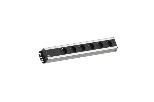 Robustes Kunststoffprofil, 2 m Zuleitung H05VV-F 3G 1,5 mm2 mit Schutzkontakt-Winkelstecker, mit integrierter Anschlussklemme für Stromleitung und zusätzlicher Ausgang für separaten Erdleiter, geschraubt und wiederanschließbar, zusätzliche Anschraublöcher, 6-fach Ausführung in 19"-Abmessungen, Dosenabstand 35mm, 2m H05VV-F3G1,5mm2, im Polybeutel mit Header