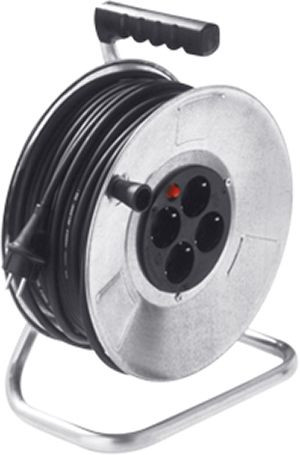 Stahlblechkabeltrommel mit 4 Steckdosen ohne Deckel, mit Thermoschutzschalter, schwarz