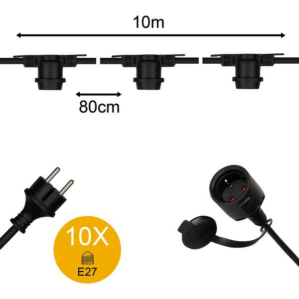 BAI Lichterkette 10m Schwarz mit 10 Fassungen E27 Max 25W pro Fassung IP44 CLII Kabel H07RN-F 2x1.5mm² mit Stecker Koppelbar. Fassungen und Lampen sollten nach unten zeigen