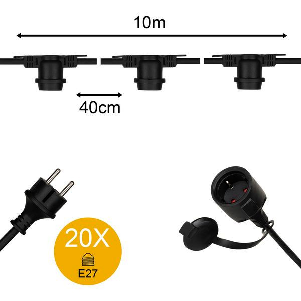 BAI Lichterkette 10M Schwarz mit 20 Fassungen E27 Max 25W pro Fassung IP44 CLII Kabel H07RN-F 2x1.5mm² mit Stecker Koppelbar. Fassungen und Lampen sollten nach unten zeigen