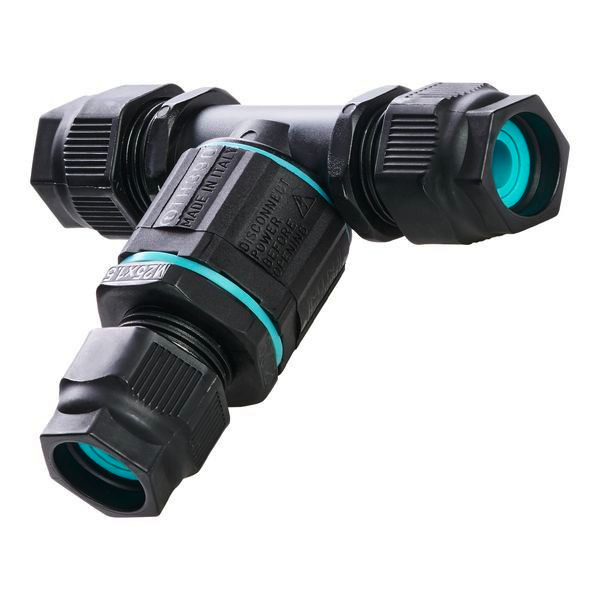 BAI Wasserdichter Verbinder TH390 Tee T-Form 1 Eingang - 2 Ausgänge 3-polig x 4mm² (max) 32A - 250V 73x92mm IP68 2 bar Schwarz