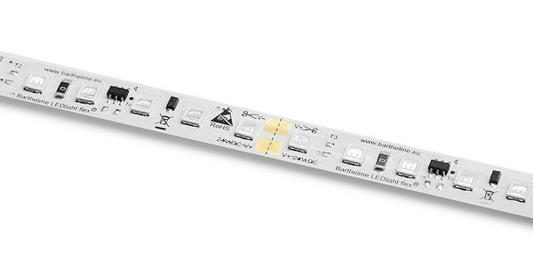 LED-Streifen für einfarbige Lichtlinien, ideal für helle, farbige Beleuchtungen (ggü. RGB heller), Lebensdauer L70 > 30.000h bei Tc < 80°C, Stromregelung durch IC für gleichbleibende Helligkeit über die gesamte Lichtlinie mit integriertem Überhitzungsschutz, mit Verpolungsschutzdiode, TVS-Überspannungsschutzdiode, mit hochwertigem 3M-Doppelklebeband