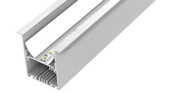 Hochwertiges Leuchtenprofil aus Aluminium, eloxiert, flexibel als Einbau- oder Leuchtenprofil einsetzbar, die Abdeckung in drei Höhen montierbar (entblendet, bündig, 180°), Abmessungen (BxH): 80x75mm