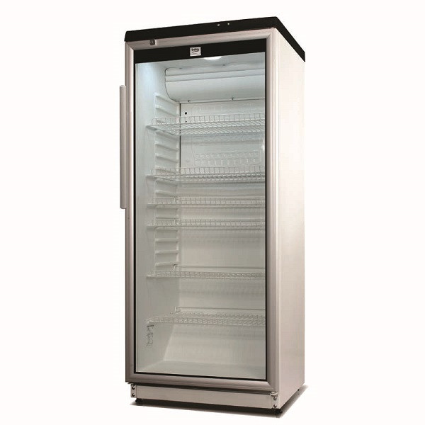 Dieser gewerblich zertifizierte Kühlschrank ist speziell für den kommerziellen Einsatz konzipiert und mit einem mechanischen Thermometer ausgestattet. Er bietet ein maximales Stauvolumen auf kleinstem Raum und ist mit einer verschließbaren Glastür ausgestattet, die sowohl Übersicht als auch Sicherheit gewährleistet. Die entnehmbaren Ablagegitter und besonders robusten Ablageflächen mit einer Traglast von bis zu 50 kg pro Ebene ermöglichen eine flexible Nutzung, ideal für stark frequentierte Einsatzbereiche. Das Gerät ist weiß, arbeitet vollständig FCKW- und FKW-frei und nutzt das umweltschonende Kältemittel R600a. Die mechanische Steuerung sorgt für eine einfache Bedienung, während die automatische Abtauung und das integrierte Wasserverdunstungssystem den Wartungsaufwand reduzieren. Ein Umluftventilator gewährleistet gleichmäßige Kühlung im gesamten Innenraum. Der robuste Griff und die fest montierte Tür (nicht wechselbar) bieten zusätzlich Stabilität im professionellen Alltag. Die integrierte Innenbeleuchtung sorgt für eine gute Übersicht, die vorderen Füße sind höhenverstellbar. Der Innenraum fasst bis zu 357 Dosen à 0,33l und ist mit sechs Einlegegittern ausgestattet (je 52,5 × 36 cm). Der Temperaturbereich liegt bei +2°C bis +12°C, die Klimaklasse ist 4. Der tägliche Energieverbrauch beträgt 2,14 kWh.