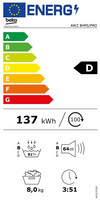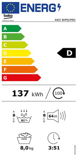 | Gewichteter Energieverbrauch pro 160 Trocknungszyklen im Programm Baumwolle | 1.37 kWh |