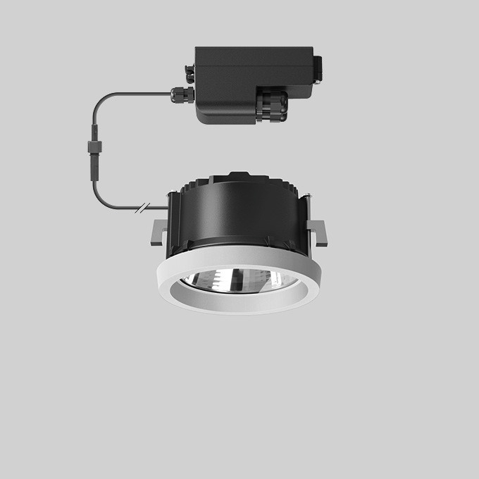 BEGA Deckeneinbau-Tiefstrahler 24449WK4. Symmetrisch breitstreuende Lichtstärkeverteilung. BEGA Hybrid Optics® : Hocheffiziente und verlustarme Lichtverteilung durch Reflektor und optischer Linse. LED, 28 W Leuchten-Anschlussleistung, Leuchten-Lichtstrom 2580 lm, Halbstreuwinkel 84°, Farbtemperatur 4000 K. Farbwiedergabeindex (CRI) > 80. Mit austauschbarem BEGA LED-Modul mit einer mittleren Bemessungslebensdauer von 75.000 Betriebsstunden (L80B50 bei ta = 25 °C). 20-jährige Nachliefergarantie auf das LED-Modul und die Verschleißteile. Mit LED-Netzteil, DALI-steuerbar, 220/240 V, 0/50-60 Hz im externen Gehäuse. Schutzart IP 65, Schutzklasse II. Ballwurfsicher. Leuchte aus Aluminiumguss, Aluminium und Edelstahl Beschichtungstechnologie BEGA Unidure® . Abschlussring aus Aluminiumguss, Farbe Weiß. Sicherheitsglas klar. Optische Silikonlinse. Reflektoroberfläche aus eloxiertem Reinstaluminium. 2 Leitungsverschraubungen mit Zugentlastung zur Durchverdrahtung der Netzanschlussleitung von ø 4-10 mm, max. 5 x 1,5 qmm. 0,7 m Verbindungsleitung zwischen Leuchte und Netzteil. Abmessungen Ø 175 x 95 mm. Leuchte für den Einbau in eine Einbauöffnung mit den Abmessungen Ø 160 x 100 mm oder in das Einbaugehäuse 10442.
