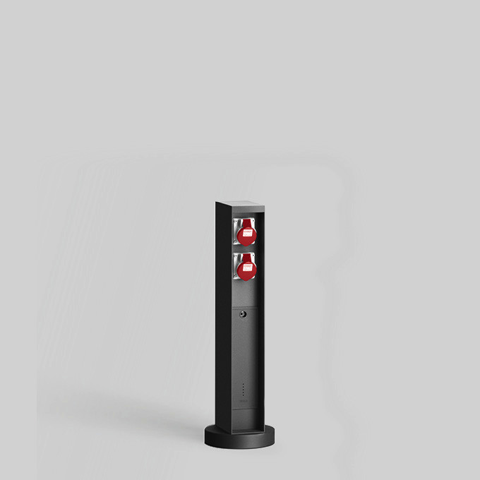 BEGA Anschlusssäule 70384, ortsfest. Eingebaute Komponenten: 2 CEE Steckdosen nach EN 60309-2, 200-250 V ? 16 A, 2P + ? Farbe blau, 2 CEE Steckdosen nach EN 60309-2, 346-415 V ? 16 A, 3P + N + ? Farbe rot. Schutzart IP X4. Aluminiumguss, Aluminium und Edelstahl Beschichtungstechnologie BEGA Unidure® , Farbe Grafit. Montagetür, 2 Kabeleinführungen mit Dichtnippel. Anschlussklemme 4 x 4 qmm und Schutzleiteranschluss. Mit Montageplatte zum Aufschrauben auf ein Fundament oder auf das Erdstück 70895. Abmessungen: 100 x 205 mm. Höhe über Flur 700 mm.
