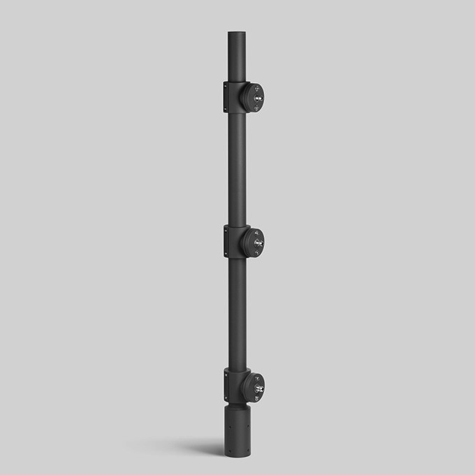 BEGA Mastaufsatz 70763 für die Montage von 3 Scheinwerfern auf einem BEGA Stahl-Lichtmast. Aluminiumguss, Aluminium und Edelstahl Beschichtungstechnologie BEGA Unidure® , Farbe Grafit. Mastzopfdurchmesser 76 mm, Einstecktiefe 150 mm. Scheinwerferbefestigung auf einem drehbaren Klemmteller mit zwei M8-Schrauben, Abstand 80 mm und G½ Gewindestutzen mit U-Scheibe und Mutter. 1 Leitungsverschraubung für Scheinwerferanschlussleitung von ø 8-11 mm. Die einzelnen Montageknoten der Scheinwerfer sind in 90°-Schritten drehbar.