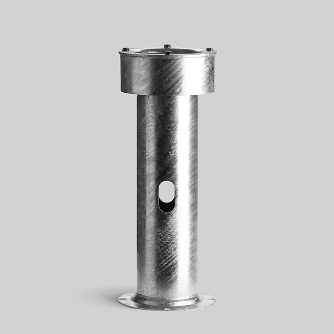 BEGA Erdstück 70898, aus feuerverzinktem Stahl, nach EN ISO 1461. Länge 800 mm. Eine Schweißkonstruktion bestehend aus Grundplatte, Rohrstück und Flanschplatte mit Gewindeeinsätzen mit Befestigungsschrauben M12 x 40 aus Edelstahl, Werkstoff-Nr. 1.4301, seitliche Leitungseinführung 100 x 50 mm. Für die Befestigung von Leuchten und Lichtmasten mit Fußplatte im Boden.