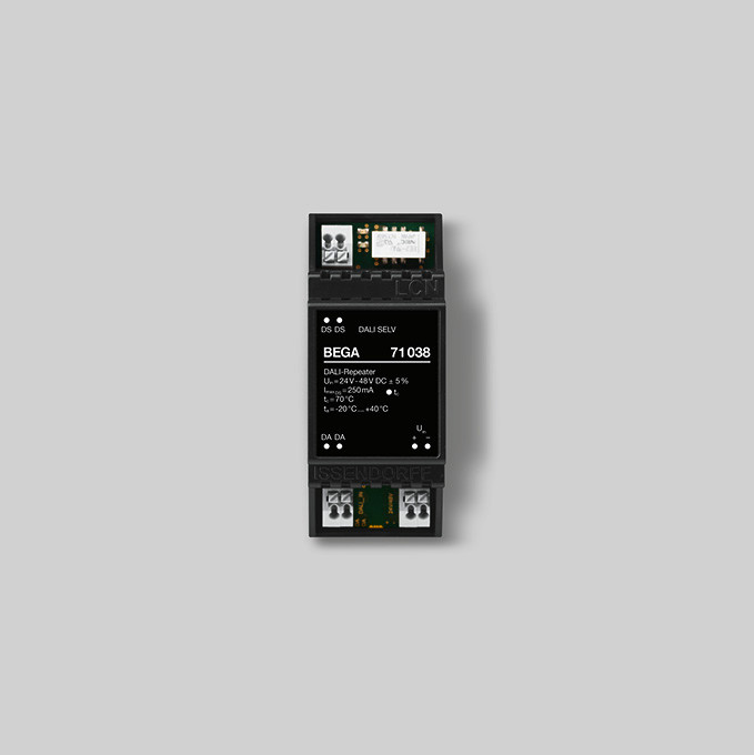BEGA DALI-Repeater 71038 für Hutschienenmontage, zur Verlängerung des DALI-Bus. Die DALI-Leitung ist so von 300 m auf bis zu 600 m verlängerbar. Der Repeater trennt die Busteilnehmer galvanisch (DS = DALI-SELV). Für max. 64 Busteilnehmer auf der gesamten DALI-Linie. Strombegrenzung ca. 250 mA, Busspannung 16 V typ. (± 10 %). Steckklemmen für 0,5 - 2,5 qmm massive Drähte, 0,5 - 1,5 qmm flexible Drähte mit Aderendhülse. Versorgungsspannung: 24-48 V ± 5 %, Strombelastbarkeit: >300 mA. Der DALI-Repeater benötigt für die Stromversorgung ein 24 V Netzteil. Abmessungen: 38 x 92 x 67 mm.
