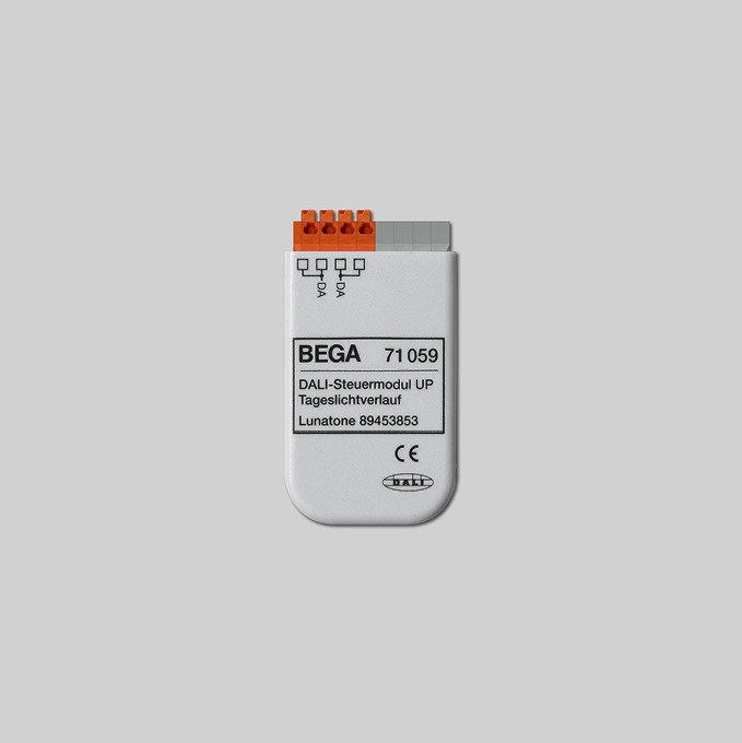 BEGA DALI-Tageslichtmodul 71059 für die tageszeit-abhängige Steuerung von Tunable-White-Leuchten. Modul für den Einbau in Schalter- und Hohlraumdosen. DALI Echtzeituhr. Automatische Sommer- / Winterzeitumschaltung einstellbar. Konfigurierbares Szenenverhalten. Interne Batterie für Uhrzeit. Anschlussklemmen 0,5-1,5 qmm. Stromversorgung über DALI-Bus, Stromaufnahme 5 mA. Abmessungen: 33 x 60 x 15 mm.