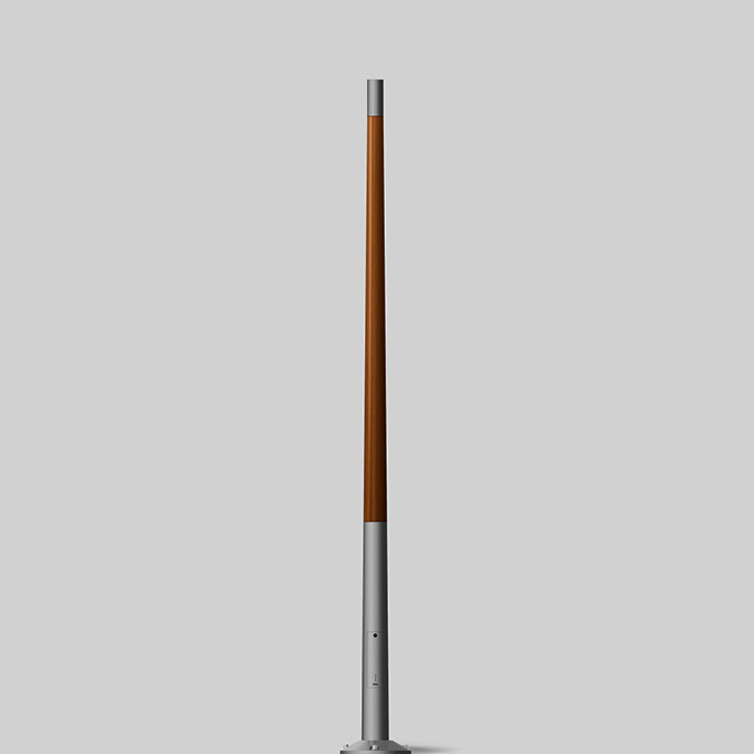 BEGA Lichtmast 71194A mit Leimholz nach DIN EN 14080 und Aluminium. Konisch, unterer Durchmesser 135 mm, mit Fußplatte Ø 340 mm. Höhe über Flur 5000 mm. Mastzopfdurchmesser 76 mm. Tür mit Vierkant-Verschluss aus Edelstahl und Gerätesteg mit Schutzleiteranschluss und zwei Schiebemuttern M6 zur Aufnahme eines Anschlusskastens. Mit Fußplatte zum Aufschrauben auf ein Fundament oder auf das Erdstück 70899.