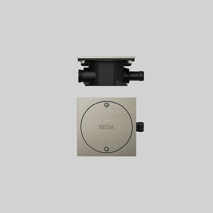 BEGA Verteilerdose 71260 für den Einbau in Boden- und Wandflächen. Zur Installation der Leitungen von Schwimmbadleuchten in Schutzklasse III. Schutzart IP 67. Schutzklasse III. Edelstahl, Werkstoff-Nr. 1.4301, elektropoliert. 4 Leitungsverschraubungen, 1 Schlauchanschluss für Weich-PVC-Schutzschlauch Ø 20 x 3 mm. Nach der Montage ist die Verteilerdose mit Vergussmasse zu vergießen. Abmessungen: 115 x 115 x 60 mm.