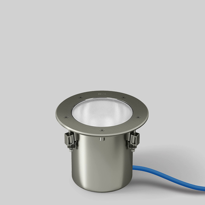 BEGA Bodeneinbauleuchte 84351RK3 für den Einbau in runde Ausschnitte, überrollbar für Druckbelastung bis 2.000 kg (~20 kN). Rutschhemmendes Glas nach DIN 51130 R 13, mattiert. Symmetrische Lichtstärkeverteilung für weichgezeichnete Beleuchtungseffekte ohne harte Lichtkegel auf der iluminierten Fläche. BEGA Constant Optics® : Effizientes optisches System, das nahezu keinem Verschleiß unterliegt. LED, 9,5 W Leuchten-Anschlussleistung, Leuchten-Lichtstrom 704 lm, Halbstreuwinkel 53°, Farbtemperatur 3000 K. Farbwiedergabeindex (CRI) > 80. Mit austauschbarem BEGA LED-Modul mit einer mittleren Bemessungslebensdauer von 135.000 Betriebsstunden (L80B50 bei ta = 25 °C). 20-jährige Nachliefergarantie auf das LED-Modul und die Verschleißteile. Mit BEGA Ultimate Driver® LED-Netzteil, DALI-steuerbar, 220-240 V, 0/50-60 Hz. Schutzart IP 68 10 m. Leuchte aus Edelstahl, Werkstoff-Nr. 1.4301. Reflektoroberfläche aus eloxiertem Reinstaluminium. Mit fest angeschlossener, wasserbeständiger Anschlussleitung 07RN8-F 5 G 1 qmm, Länge 1,8 m, mit eingebautem Wasserstopper und 1,2 m PVC-Installationsrohr. Leuchtendurchmesser 205 mm, Einbautiefe 170 mm. Einbauöffnung Ø 182 mm.