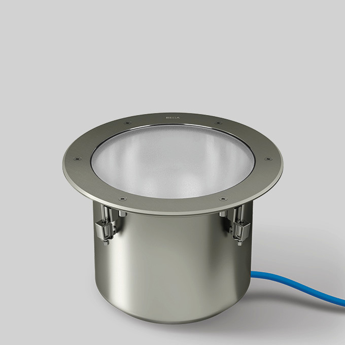 BEGA Bodeneinbauleuchte 84353RK27 für den Einbau in runde Ausschnitte, überrollbar für Druckbelastung bis 2.000 kg (~20 kN). Rutschhemmendes Glas nach DIN 51130 R 13, mattiert. Symmetrische Lichtstärkeverteilung für weichgezeichnete Beleuchtungseffekte ohne harte Lichtkegel auf der iluminierten Fläche. LED, 30 W Leuchten-Anschlussleistung, Leuchten-Lichtstrom 2544 lm, Halbstreuwinkel 54°, Farbtemperatur 3000 K. Farbwiedergabeindex (CRI) > 80. Mit austauschbarem BEGA LED-Modul mit Übertemperaturschutz und einer Lebenserwartung von mindestens 50.000 Betriebsstunden. 20-jährige Nachliefergarantie auf das LED-Modul und die Verschleißteile. Mit BEGA Ultimate Driver® LED-Netzteil, DALI-steuerbar, 220-240 V, 0/50-60 Hz. Schutzart IP 68 10 m. Leuchte aus Edelstahl, Werkstoff-Nr. 1.4301. Reflektoroberfläche aus eloxiertem Reinstaluminium. Mit fest angeschlossener, wasserbeständiger Anschlussleitung 07RN8-F 5 G 1 qmm, Länge 1,8 m, mit eingebautem Wasserstopper und 1,2 m PVC-Installationsrohr. Leuchtendurchmesser 330 mm, Einbautiefe 225 mm. Einbauöffnung Ø 300 mm.