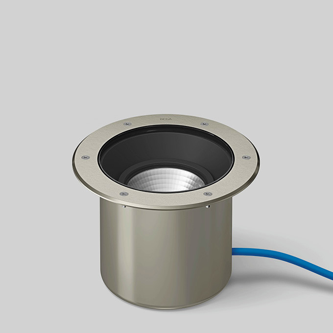 BEGA Bodeneinbauleuchte 84800K3, überrollbar für Druckbelastung bis 2.000 kg (~20 kN). BEGA Hybrid Optics® : Hocheffiziente und verlustarme Lichtverteilung durch Reflektor und optischer Linse. Rotationssymmetrisch streuende Lichtstärkeverteilung. Optisches System 0-30° schwenkbar und um 360° stufenlos drehbar. LED, 26,2 W Leuchten-Anschlussleistung, Leuchten-Lichtstrom 2556 lm, Halbstreuwinkel 18°, Farbtemperatur 3000 K. Farbwiedergabeindex (CRI) > 80. Mit austauschbarem BEGA LED-Modul mit einer mittleren Bemessungslebensdauer von 120.000 Betriebsstunden (L80B50 bei ta = 25 °C). 20-jährige Nachliefergarantie auf das LED-Modul und die Verschleißteile. Mit BEGA Ultimate Driver® LED-Netzteil, DALI-steuerbar , 220-240 V, 0/50-60 Hz. Schutzart IP 68 10 m. Leuchte aus Edelstahl, Werkstoff-Nr. 1.4301. Sicherheitsglas klar. Reflektor aus eloxiertem Reinstaluminium. Optische Silikonlinse. 1,8 m wasserbeständige Anschlussleitung 07RN8-F 5 G 1 qmm mit eingebautem Wasserstopper und 1,2 m PVC-Installationsrohr. Leuchtendurchmesser 280 mm, Einbautiefe 185 mm.