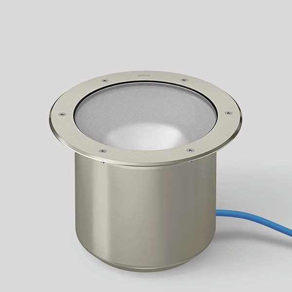 BEGA Bodeneinbauleuchte 84804RK3, überrollbar für Druckbelastung bis 2.000 kg (~20 kN). Rutschhemmendes Glas nach DIN 51130 R 13, mattiert. BEGA Hybrid Optics® : Hocheffiziente und verlustarme Lichtverteilung durch Reflektor und optischer Linse. Rotationssymmetrisch breitstreuende Lichtstärkeverteilung. Optisches System 0-30° schwenkbar und um 360° stufenlos drehbar. LED, 38,5 W Leuchten-Anschlussleistung, Leuchten-Lichtstrom 3017 lm, Halbstreuwinkel 64°, Farbtemperatur 3000 K. Farbwiedergabeindex (CRI) > 80. Mit austauschbarem BEGA LED-Modul mit einer mittleren Bemessungslebensdauer von 90.000 Betriebsstunden (L80B50 bei ta = 25 °C). 20-jährige Nachliefergarantie auf das LED-Modul und die Verschleißteile. Mit BEGA Ultimate Driver® LED-Netzteil, DALI-steuerbar, 220-240 V, 0/50-60 Hz. Schutzart IP 68 10 m. Leuchte aus Edelstahl, Werkstoff-Nr. 1.4301. Reflektor aus eloxiertem Reinstaluminium. Optische Silikonlinse. 1,8 m wasserbeständige Anschlussleitung 07RN8-F 5 G 1 qmm mit eingebautem Wasserstopper und 1,2 m PVC-Installationsrohr. Leuchtendurchmesser 330 mm, Einbautiefe 225 mm.