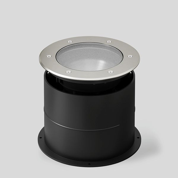BEGA Bodeneinbauleuchte 84903RK3, überrollbar für Druckbelastung bis 5.000 kg (~50 kN) mit einstellbarer Lichtstärkeverteilung. Rutschhemmendes Glas nach DIN 51130 R 13, mattiert. Optisches System 0-25° schwenkbar und um 360° stufenlos drehbar. Breitstreuende Lichtstärkeverteilung. LED, 50 W Leuchten-Anschlussleistung, Leuchten-Lichtstrom 3463 lm, Halbstreuwinkel 64°, Farbtemperatur 3000 K. Farbwiedergabeindex (CRI) > 80. Mit austauschbarem BEGA LED-Modul mit einer mittleren Bemessungslebensdauer von 130.000 Betriebsstunden (L80B50 bei ta = 25 °C). 20-jährige Nachliefergarantie auf das LED-Modul und die Verschleißteile. Mit BEGA Ultimate Driver® LED-Netzteil, DALI-steuerbar, 220-240 V, 0/50-60 Hz. Schutzart IP 68 10 m. Leuchten- und Einbaugehäuse aus hochkorrosionsfestem Aluminium. Beschichtungstechnologie BEGA Tricoat® Druckaufnahmering aus glasfaserverstärktem Kunststoff. Abdeckring aus Edelstahl, Werkstoff-Nr. 1.4301. Reflektoroberfläche aus eloxiertem Reinstaluminium. BEGA Hybrid Optics® : Hocheffiziente und verlustarme Lichtverteilung durch Reflektor und optischer Linse. 1,8 m wasserbeständige Anschlussleitung 07RN8-F 5 G 1 qmm mit eingebautem Wasserstopper und 1,2 m PVC-Installationsrohr. Leuchtendurchmesser 330 mm, Einbautiefe 250 mm. Einbauöffnung Ø 355 mm.