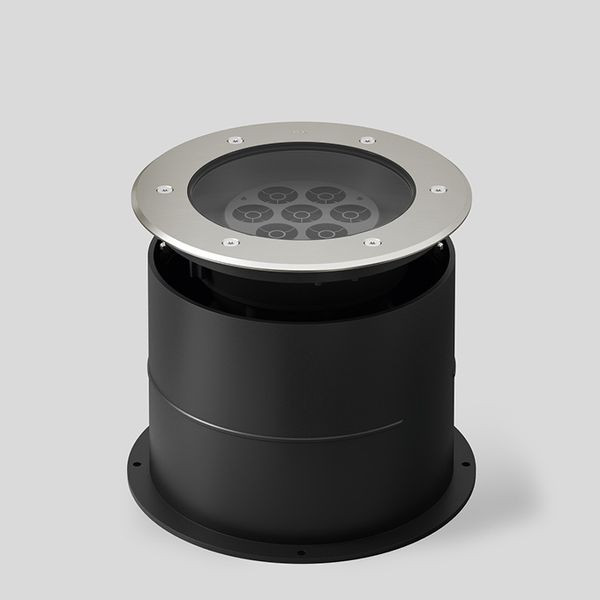 BEGA Bodeneinbauleuchte 85043K27, überrollbar für Druckbelastung bis 5.000 kg (~50 kN). Fokussierte Lichtstärkeverteilung mit eingebautem Raster zur Streulichtreduzierung. LED, 33 W Leuchten-Anschlussleistung, Leuchten-Lichtstrom 1060 lm, Halbstreuwinkel 5°, Farbtemperatur 2700 K. Farbwiedergabeindex (CRI) > 80. Mit austauschbarem BEGA LED-Modul mit Übertemperaturschutz und einer Lebenserwartung von mindestens 50.000 Betriebsstunden. 20-jährige Nachliefergarantie auf das LED-Modul und die Verschleißteile. Mit BEGA Ultimate Driver® LED-Netzteil, DALI-steuerbar, 220-240 V, 0/50-60 Hz. Schutzart IP 68 10 m. Leuchten- und Einbaugehäuse aus hochkorrosionsfestem Aluminium. Beschichtungstechnologie BEGA Tricoat® Druckaufnahmering aus glasfaserverstärktem Kunststoff. Abdeckring aus Edelstahl, Werkstoff-Nr. 1.4301. Sicherheitsglas klar. Reflektoroberfläche aus eloxiertem Reinstaluminium. BEGA Hybrid Optics® : Hocheffiziente und verlustarme Lichtverteilung durch Reflektor und optischer Linse. 1,8 m wasserbeständige Anschlussleitung 07RN8-F 5 G 1 qmm mit eingebautem Wasserstopper und 1,2 m PVC-Installationsrohr. Leuchtendurchmesser 330 mm, Einbautiefe 250 mm. Einbauöffnung Ø 355 mm.