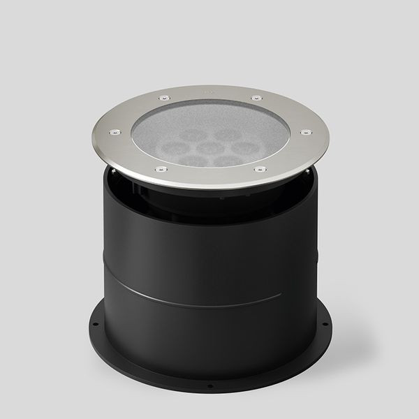 BEGA Bodeneinbauleuchte 85043RK27, überrollbar für Druckbelastung bis 5.000 kg (~50 kN). Rutschhemmendes Glas nach DIN 51130 R 13, mattiert. Fokussierte Lichtstärkeverteilung mit eingebautem Raster zur Streulichtreduzierung. LED, 33 W Leuchten-Anschlussleistung, Leuchten-Lichtstrom null, Halbstreuwinkel 5°, Farbtemperatur 2700 K. Farbwiedergabeindex (CRI) > 80. Mit austauschbarem BEGA LED-Modul mit Übertemperaturschutz und einer Lebenserwartung von mindestens 50.000 Betriebsstunden. 20-jährige Nachliefergarantie auf das LED-Modul und die Verschleißteile. Mit BEGA Ultimate Driver® LED-Netzteil, DALI-steuerbar, 220-240 V, 0/50-60 Hz. Schutzart IP 68 10 m. Leuchten- und Einbaugehäuse aus hochkorrosionsfestem Aluminium. Beschichtungstechnologie BEGA Tricoat® Druckaufnahmering aus glasfaserverstärktem Kunststoff. Abdeckring aus Edelstahl, Werkstoff-Nr. 1.4301. Reflektoroberfläche aus eloxiertem Reinstaluminium. BEGA Hybrid Optics® : Hocheffiziente und verlustarme Lichtverteilung durch Reflektor und optischer Linse. 1,8 m wasserbeständige Anschlussleitung 07RN8-F 5 G 1 qmm mit eingebautem Wasserstopper und 1,2 m PVC-Installationsrohr. Leuchtendurchmesser 330 mm, Einbautiefe 250 mm. Einbauöffnung Ø 355 mm.