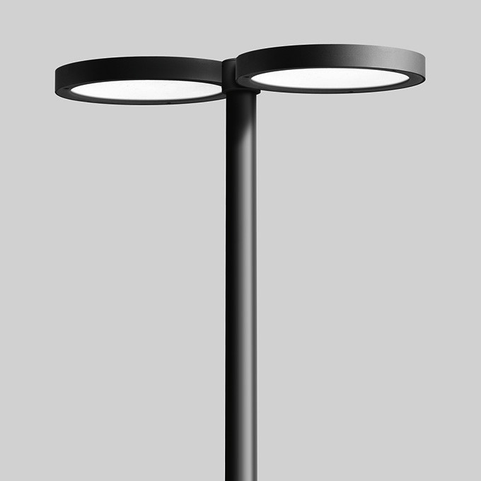 BEGA Aufsatzleuchte 99408K4 in 2-fach-Anordnung. Asymmetrisch-bandförmige Lichtstärkeverteilung. Dark Sky: Kein Lichtstromanteil im oberen Halbraum. BEGA Constant Optics® : Effizientes optisches System, das nahezu keinem Verschleiß unterliegt. Lichtlenkung durch alterungsbeständiges, polymerfreies optisches System. LED 26,4 W Leuchten-Anschlussleistung, Leuchten-Lichtstrom 3378 lm, Farbtemperatur 4000 K. Farbwiedergabeindex (CRI) > 80 je Leuchtenkörper. Mit austauschbaren BEGA LED-Modulen mit Übertemperaturschutz und einer Lebenserwartung von mindestens 50.000 Betriebsstunden. 20-jährige Nachliefergarantie auf LED-Module und Verschleißteile. Mit BEGA Ultimate Driver® LED-Netzteil, DALI-steuerbar, 220-240 V, 0/50-60 Hz. Schutzart IP 65, Schutzklasse II. Leuchte aus Aluminiumguss, Aluminium und Edelstahl Beschichtungstechnologie BEGA Unidure® , Farbe Grafit. Sicherheitsglas mit optischer Struktur. Reflektor aus eloxiertem Reinstaluminium. Anstellwinkel einstellbar auf 0° oder 15°. Mit fest angeschlossener Anschlussleitung X05BQ-F 4 x 1 mm², Länge 6 m. Mastzopfdurchmesser 76 mm, Einstecktiefe 90 mm. Für Lichtpunkthöhen von 4000 - 6000 mm. Abmessungen Ø 470 x 70 x 1125 mm.