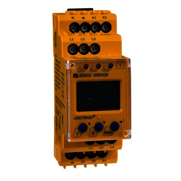 Die multifunktionalen Spannungsüberwachungsrelais VMD420 überwachen Frequenzen, Unterspannungen, Überspannungen und die Spannung zwischen zwei Schwellwerten in 3(N)AC-Systemen. Die Spannungen werden als Effektivwerte gemessen. Der aktuelle Messwert wird permanent auf dem LC-Display angezeigt. Der zum Schalten der Alarmrelais führende Messwert wird gespeichert. Durch einstellbare Verzögerungszeiten können anlagenspezifische Eigenschaften berücksichtigt werden z.B. gerätebedingte Anlaufphasen, kurzzeitige Spannungsänderungen usw. Die Geräte benötigen eine separate Versorgungsspannung.
