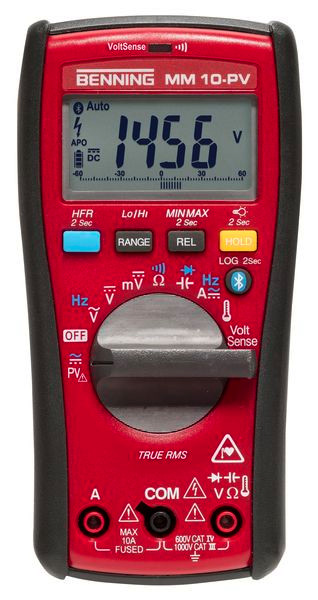 Benning MM 10-PV True RMS Digital-Multimeter für PV-Anlagen und Anwendungen mit hohen Systemspannungen. 4-stellig, beleuchtete LCD-Anzeige (6000 Punkte) mit Bargraph. Gleichspannung 100 µV - 1000 V (2000 V über TA PV), Wechselspannung 100 µV - 1000 V (1500 V über TA PV), Strom 1 mA - 10 A AC/DC, Widerstand 0,1 Ohm - 40 MOhm, Kapazität 1 nF - 10 mF, Frequenz 1 Hz - 100 kHz, Temperatur -40 °C - +400 °C. Durchgangsprüfung (< 20 Ohm - 200 Ohm)/ Diodenprüfung (1,5 V). Echteffektivwertmessung TRUE RMS. Datenlogger- und Speicherfunktion (4000 Messwerte). Schnittstelle Bluetooth. Kostenlose IOS- und Android-App BENNING MM-CM Link zum Download, Speichern und Teilen von Messwerten via Smartphone/Tablet. AutoV-Funktion für automatische AC/ DC-Spannungserkennung. Niedrige Eingangsimpedanz (LoZ) zur Unterdrückung von kapazitiv/induktiv eingestreuten Spannungen. Tiefpassfilter (HFR 800 Hz) für Messungen an getakteten Motorantrieben. Voltsensor zur berührungslosen Phasen- und Kabelbruchprüfung (rote LED). Messbereichswahl, Abschaltung, Batterieunterspannungsanzeige automatisch. HOLD, MAX/MIN, REL. CAT IV 600 V/ CAT III 1000 V. Inklusive Messadapter BENNING TA PV, Messleitungs-/ Krokodilklemmensatz, Tasche, Drahttemperaturfühler, 2 x 1.5 V Mignon/AA/LR6 Batterien, Sicherung 11 A (10218772).