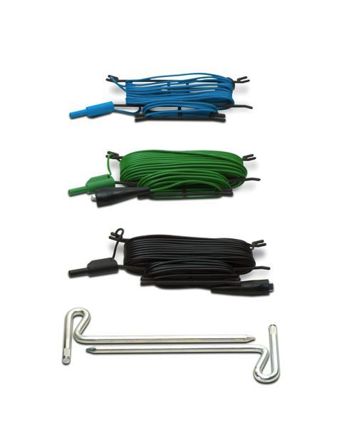 Erdungsset. Für Erdungsmessungen über Dreileiter-Messmethode. Bestehend aus 2 Erdspießen und 3 Prüfleitungen (2 x Länge = 20 m, 1 x Länge = 4,5 m).